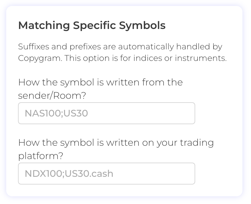 For example : sender send orders like : GOLD and US500 , the receiver has the symbol XAUUSD and SP500